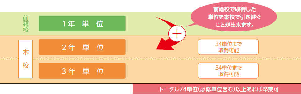 3年間で必修科目を含めて74単位取得すれば卒業できます。本校では前籍校で取得した単位も活かすことができますから、より短い期間で卒業可能です。