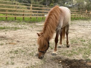 ゴエモンは北海道和種とハフリンガーのミックスで栗毛の中に白い毛がたくさんあるのが特徴です。