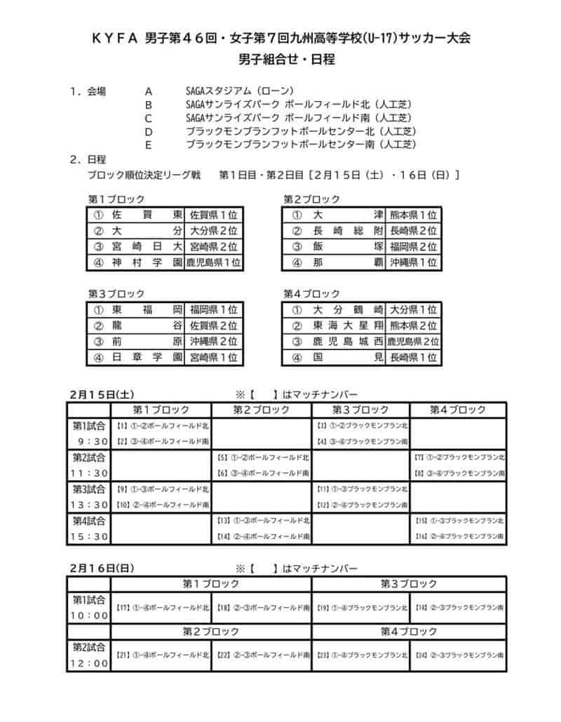 KYFA 男子第46回九州高等学校(U-17)サッカー大会が2月15日(土)から、