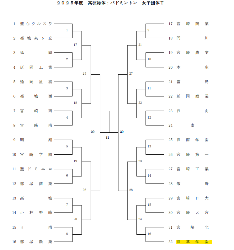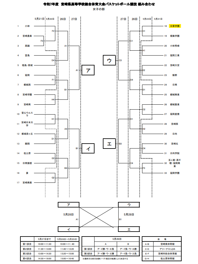 | バスケ (日章学園高校) | 5月21日(水)~5月29日(木) | 女子組合せ表 | 宮崎県体育館 ほか |
