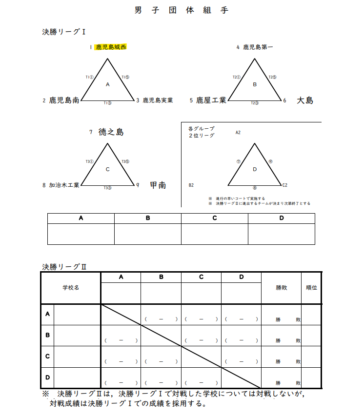 | 空手 (鹿児島城西高校) | 5月27日(火)~5月28日(水) | 男子団体組合せ表 | 鹿児島県総合体育センター体育館 |