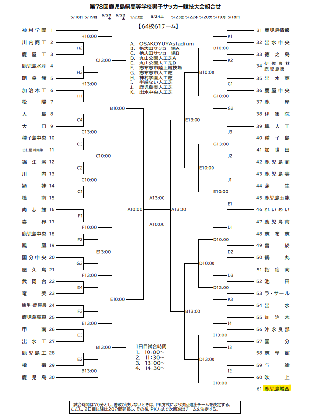 | サッカー (鹿児島城西高校) | 5月18日(日)~5月24日(土) | 男子組合せ表 | OSAKO YUYA stadium ほか |