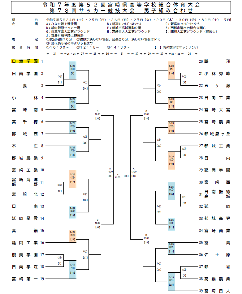| サッカー (日章学園高校) | 5月24日(土)~5月31日(土) | 男子組合せ表 | ひなた陸上競技場 ほか |