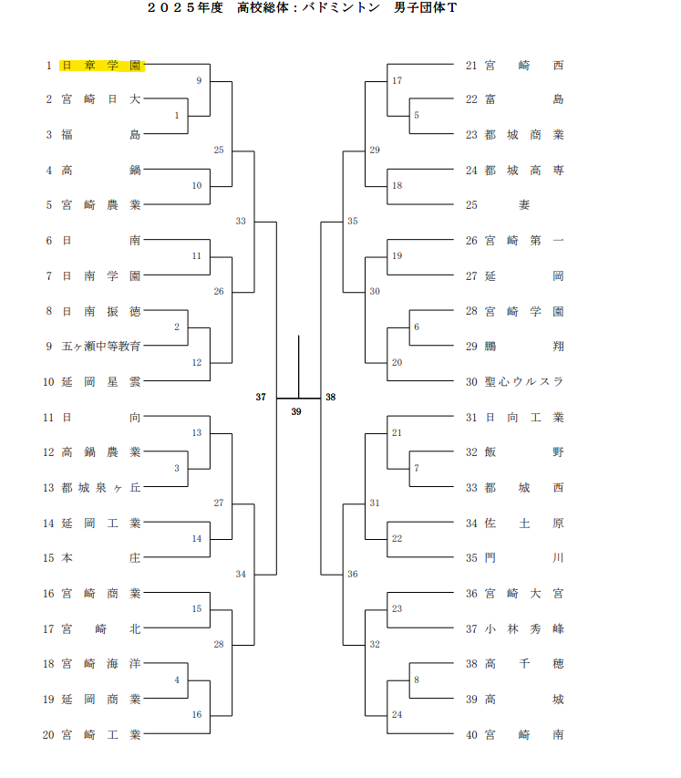 | バドミントン (日章学園高校) | 5月22日(木)~5月25日(日) | 男子団体組合せ表 | 井上スポーツセンター ほか |
