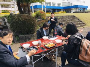 えびのは桜の花が満開になり見頃を迎えました。本校でも3月22日(月)に校内の桜を見ながらみんなでお弁当を食べました。アウトドアグッズも準備し、コーヒーやラーメンのふるまいもあり、生徒と教員で楽しいお花見となりました。そのあとはスポーツ交流会を体育館で実施し、バドミントンと卓球競技で担任の先生とも勝負し、大変盛り上がりました。