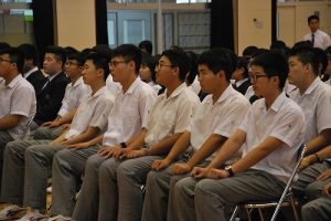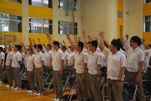 留学生が日本の大学に進学するための共通試験である日本留学試験が6月18日(日)に行われます。その壮行会が6月17日(土)本校体育館で行われました。日本人生徒代表の大山くんが「これまでみなさんの努力を見てきました。自分の力を発揮できるよう最善を尽くしてください」と励ましの言葉を述べました。留学生たちは大山くんの励ましを受けて、試験への気持ちをより一層固めたようでした。最後にみんなで勝ち鬨の声を上げ、留学生は試験に出発しました。