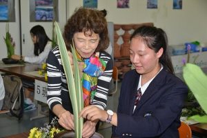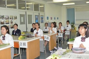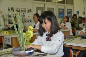 6月27日(火)本校講師の馬籠豊裕先生による華道教室が開かれました。対象は3年1組の留学生であり、留学生たちのほとんどが初めての体験でした。生徒たちは華道の作法や礼法を学んだ後、あじさいなどの季節の花を心を込めて生けました。心を落ち着けて花とじっくり向き合った生徒たちの表情は、明るくはつらつとしていました。