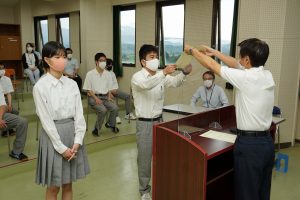 7月16日(金)生徒会任命式がありました。生徒会長に選ばれたのは3年生の松尾大志くんです。松尾くんは在校生の中で一番本校が長く、今年の6月には英検2級に合格し他の模範となる生徒です。松尾君は「自分のこれまでの経験を活かし、笑顔や希望が溢れる学校にしたい」と生徒会長としての目標を語ってくれました。