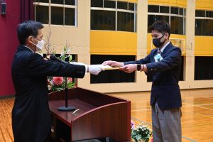 令和3年度第38回卒業式が挙行されました。5名の生徒が卒業証書を手にし、新たなステージへ旅立ちました。式典では卒業生代表の松尾君が「思い描いていたものとは違う道を歩むことになり、正直、目の前は真っ暗でどうしようもない気持ちでいっぱいでした。しかし、その先には想像も付かないような明るい道が広がっていて、たくさんのことを学び、自分を高めることができました。」と述べた後、自身が励まされたというネルソンマンデラの「The greatest glory in living lies not in never falling , but in rising every time we fall(生きる上でもっとも雄大な栄光は、決して転ばないことではない、転ぶたびに起き上がり続けることにある。)」という言葉を在校生に贈りました。