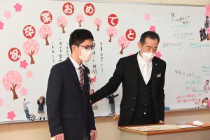 式典後にはクラスで最後の学級指導があり、卒業生一人ひとりにスポットライトがあてられた良い卒業式となりました。