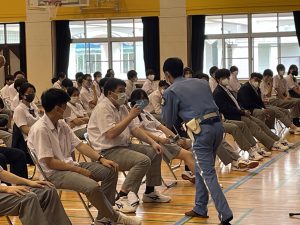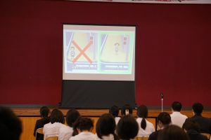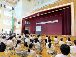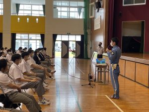 6月27日(月)本校体育館で交通安全教室がありました。えびの警察署の方においでいただき1時間講習を受けました。交通ルールや事故につながりやすいケース等を映像で学び、また横断する歩行者の新しいルールについても説明を受けました。講習は大変分かりやすく、交通安全への意識を高める良い機会となりました。