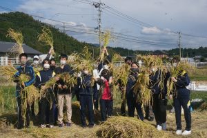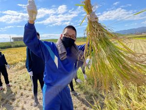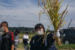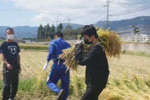 秋も深まり、えびの市は稲刈りの時期を迎えました。10月13日(水)學校の近くの田んぼで生徒たちが稲刈り体験をしました。晴れ渡る青空の下、気持ちよく稲刈りができました。生徒たちは最初は鎌の使い方もおぼつかない様子でしたが、慣れてくるとざくざくと刈れるようになり、収穫した稲穂の山がたくさんできていました。
