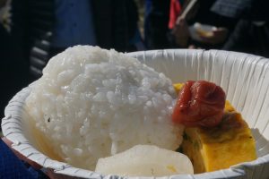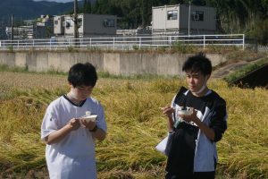 最後に田んぼを貸してくださった柳田さんからえびの産ヒノヒカリ新米で作ったおにぎりや卵焼き、お漬物をいただきました。
