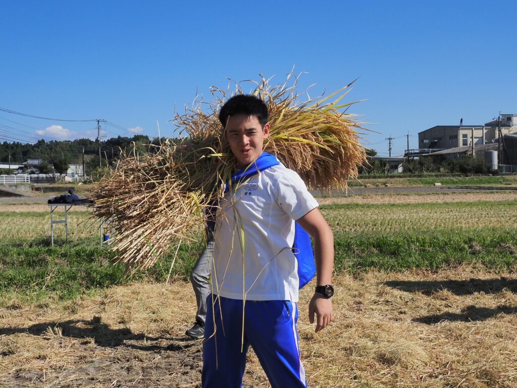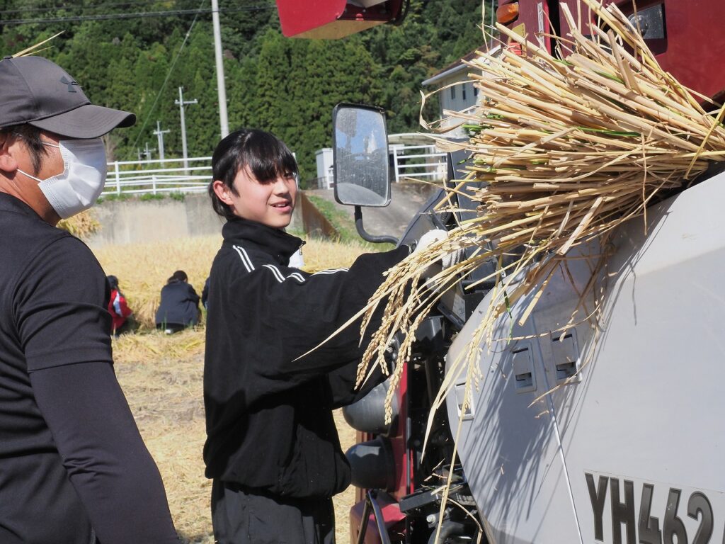 10月25日(水)えびの市の農家柳田さんの協力を得て、稲刈り体験を実施しました。生徒たちの中には初めて鎌を持つ生徒もいましたが、慣れてくるとスムーズに稲を刈ることができていました。今回はコンバインでの脱穀の作業もあり、皆で作業分担し楽しそうに取り組んでいました。稲刈りの最後にはえびのの新米で作られたおにぎりや卵焼きを頂き、生徒たちはおいしそうにほおばっていました。