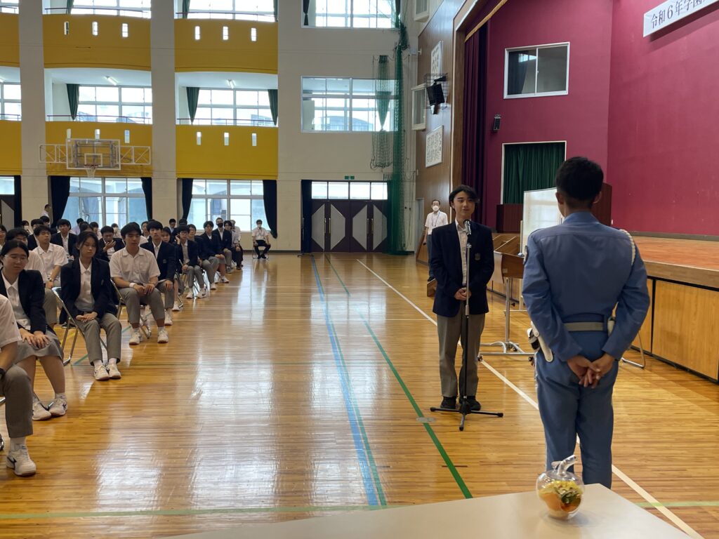 6月24日(月)本校体育館でえびの警察署の方による交通安全教室がありました。本校は寮生や自転車通学生が多いため、主に横断方法や自転車走行に関わるルールについて説明をしていただきました。最後には生徒会長の内倉さんが「普段何も考えずに歩いていましたが、歩行者にも多くの危険が潜んでいることを実感しました。今後は今日教えていただきたことを意識して交通安全に努めていきます。」と感謝の言葉を述べました。