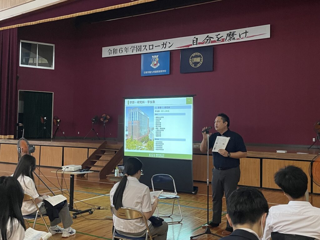 10月3日(木)本校体育館で関東学院大学の説明会がありました。本校の卒業生もオンラインを通じてですが、登場し大学生活について語ってくれました。また質疑応答の時間があり生徒たちは積極的に質問していました。先輩からの「大学受験の面接は緊張するけれど、自分の長所をアピールすることが大事。何か手伝えることがあればいつでも連絡してほしい」と後輩を励ましました。