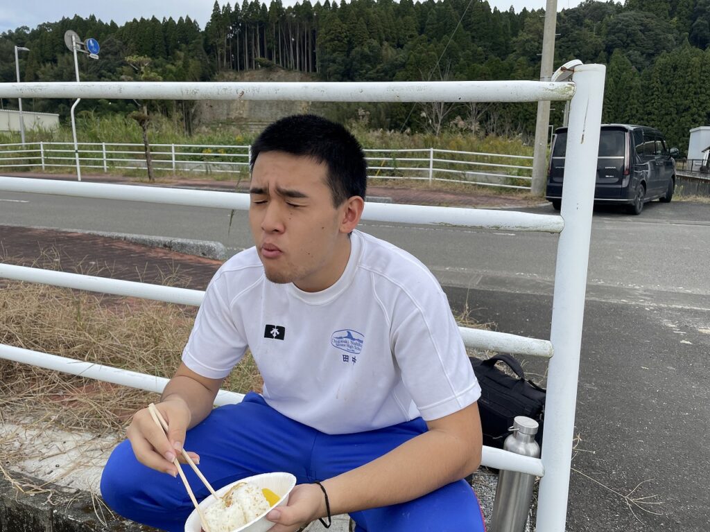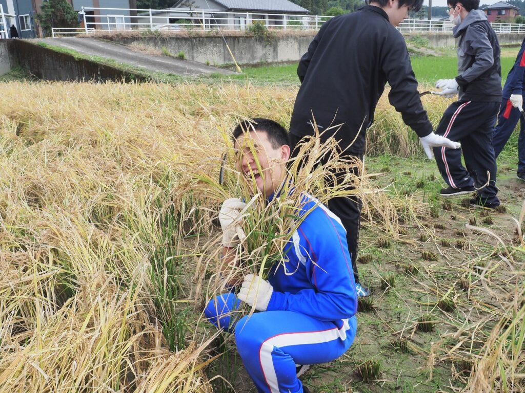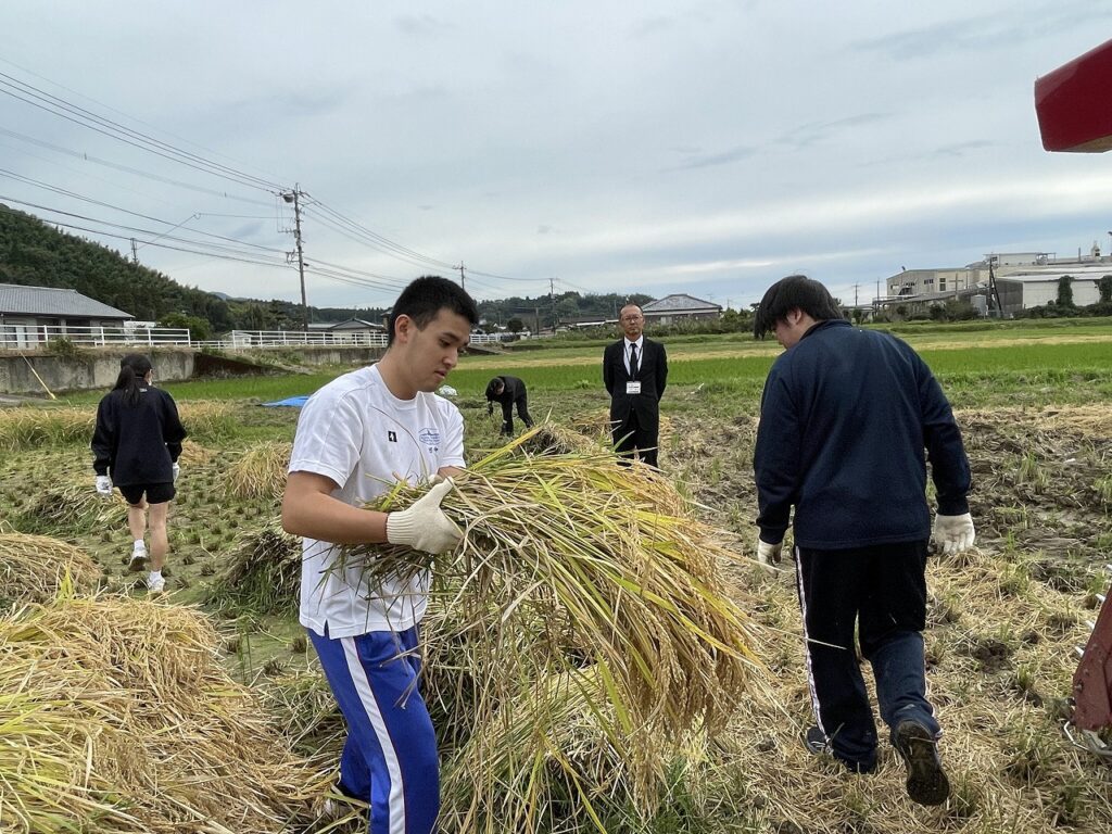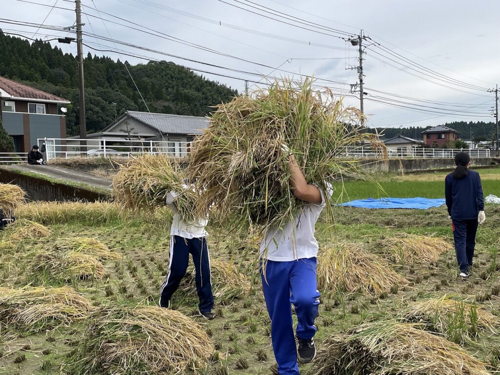 11月5日(火)にえびの市の農家柳田さんの協力を得て、稲刈り体験を実施しました。生徒たちは秋晴れの涼しい風の中で鎌を使って手作業で稲を刈りました。稲刈りの後には柳田さんから新米で炊いたおにぎりと卵焼きの差し入れをいただき、みんなでいただきました。生徒たちは「立ったり座ったり大変だった」「疲れが吹き飛ぶくらいおにぎりがおいしかった」「鎌の使い方、お米の水分量、脱穀について学べた」「食べ物を収穫する大変さを知ることができた」「お米がふっくらで噛めば噛むほど甘くなった」などの感想を述べていました。