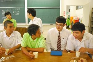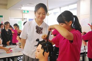 6/7(木)本校と日章学園高校との交流会がありました。盛大な歓迎式典の後、ヘアーデザインや福祉科など特色ある学科に分かれて体験授業を受けました。日章学園高校の生徒に手取り足取り教えてもらうことで、生徒同士の交流も深まったようでした。交流会の後には宮崎市で行われた進学ガイダンスに参加し、多くの大学の説明を聞き進路選択の参考にできたようです。帰りは宮崎サンビーチに寄って、宮崎の海を満喫できました。