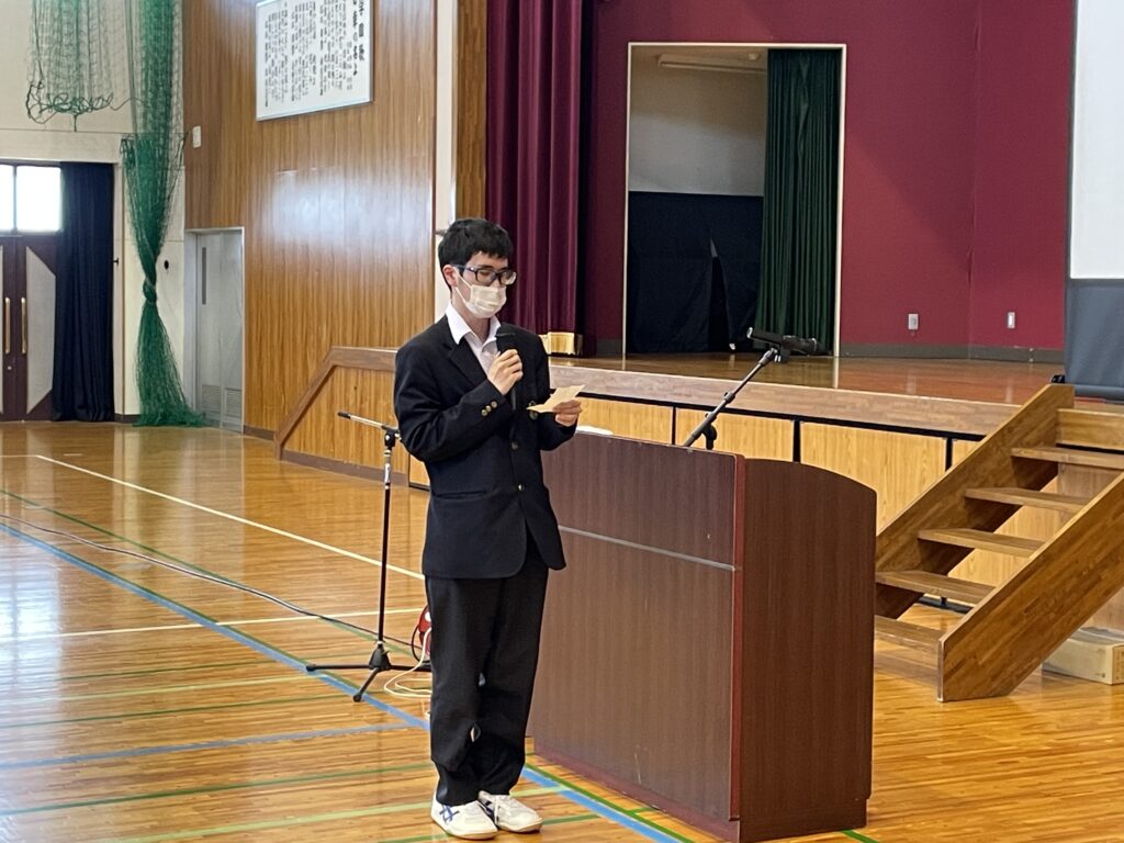 5月12日(月)、本校体育館にて、えびの警察署えびの交通安全協会の方々による交通安全教室が開催されました。はじめに、交通ルールや事故につながる危険についてのアニメを視聴し、次に、自転車に乗る前に大切なヘルメットの着用や点検の重要性について、わかりやすくご説明いただきました。
