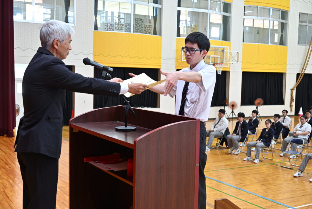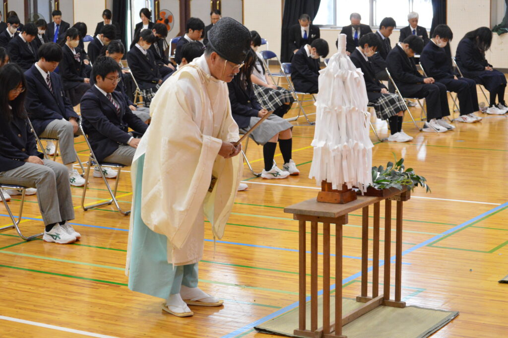 生徒たちは秋休みを終え、10月1日(水)から後期をスタートさせました。1時間目には生徒の安全、受験生の合格祈願として、えびの市水流菅原神社の宮司さんをお迎えして神事を行っていただきました。2時間目に始業式があり、生徒の意見発表や高文祭将棋部門個人3位になった濵砂和希さんの表彰がありました。後期のスタートとしてふさわしい式でした。