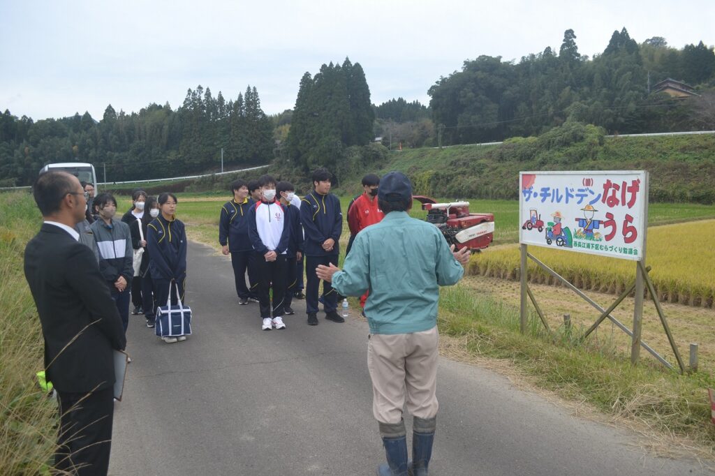 11月5日(水)稲刈りをしました。えびの市はおいしいお米の産地で、稲刈りの季節を迎えました。本校生徒も地域の有限会社ながえ村生産組合の方々に協力していただいて稲刈り体験をさせていただきました。
