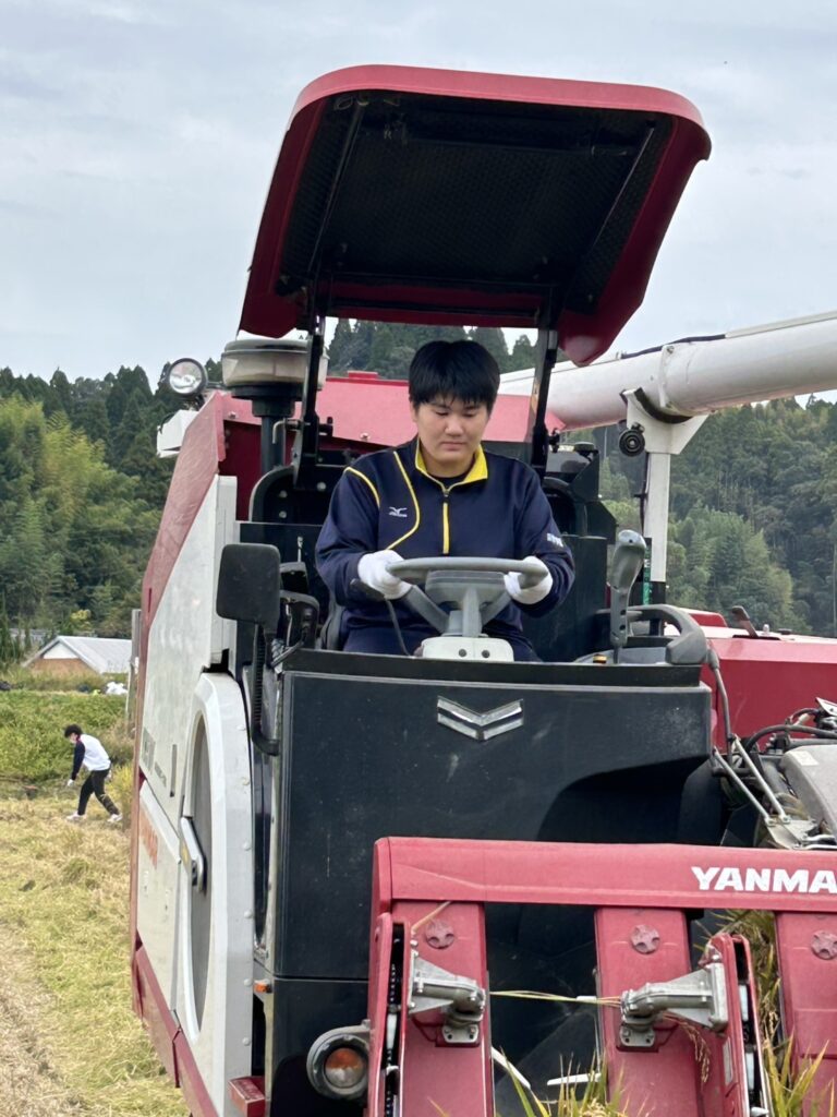 生徒たちは鎌を手に実際に稲を刈り取る作業やコンバインでの作業を体験しました。初めて稲刈りをする生徒も多く、昨年経験した先輩が優しく教えてあげている様子も見られました。