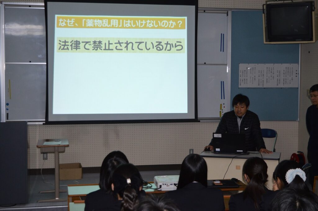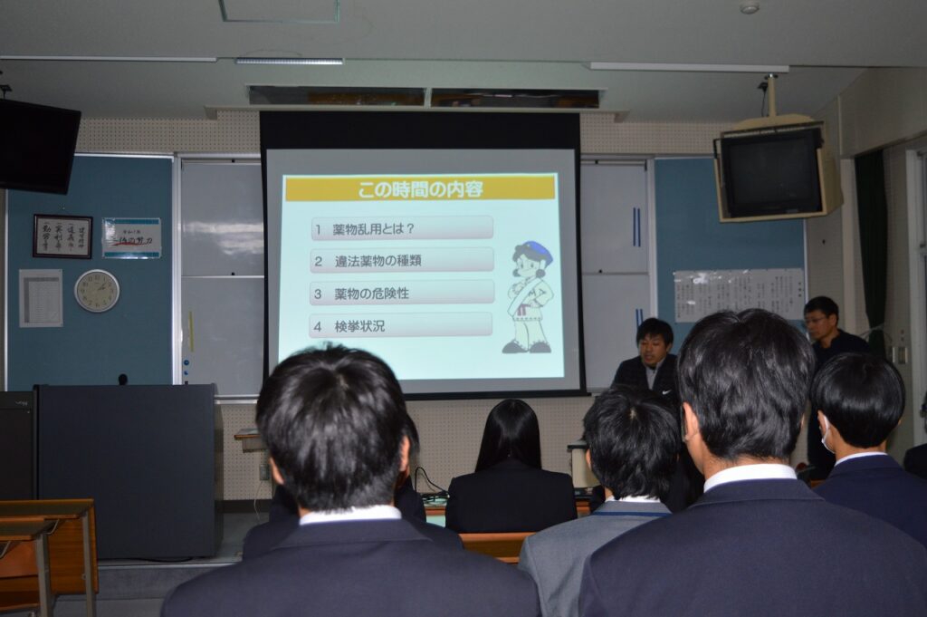 教室では、薬物が心身に及ぼす深刻な影響や、一般の人による薬物事犯の検挙数が年々増加している現状について、具体的なデータをもとに詳しく説明していただきました。薬物の危険性が決して他人事ではなく、私たちの身近なところにまで迫っているというお話に、生徒たちは真剣な表情で耳を傾けていました。