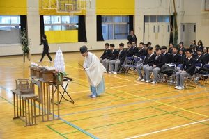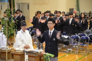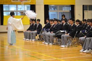 1月8日(火)に本校体育館で合格祈願祭を行いました。水流菅原神社の宮司さんに対応来校していただき、3年生の合格を祈願する神事を執り行いました。厳粛な雰囲気の中で、生徒たちはそれぞれ自分の理想の大学を心に描きながら、拝礼しました。神事の後は受験生に栄養をつけてもらおうと焼き肉会を実施しました。