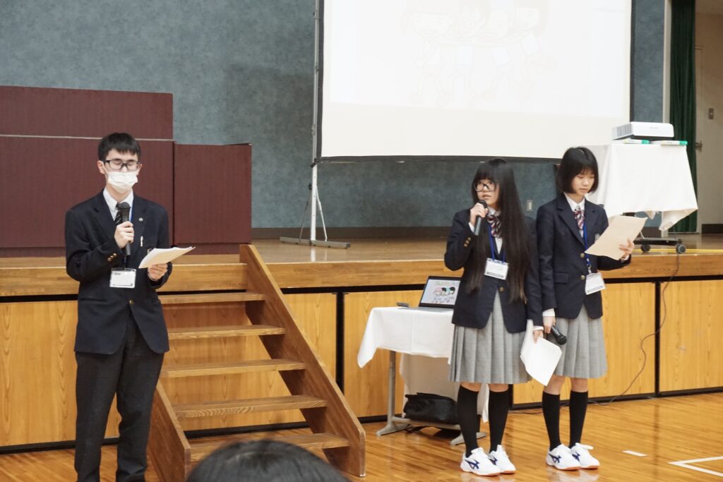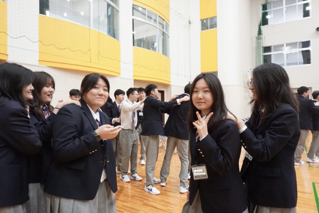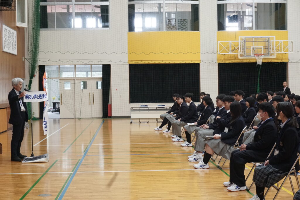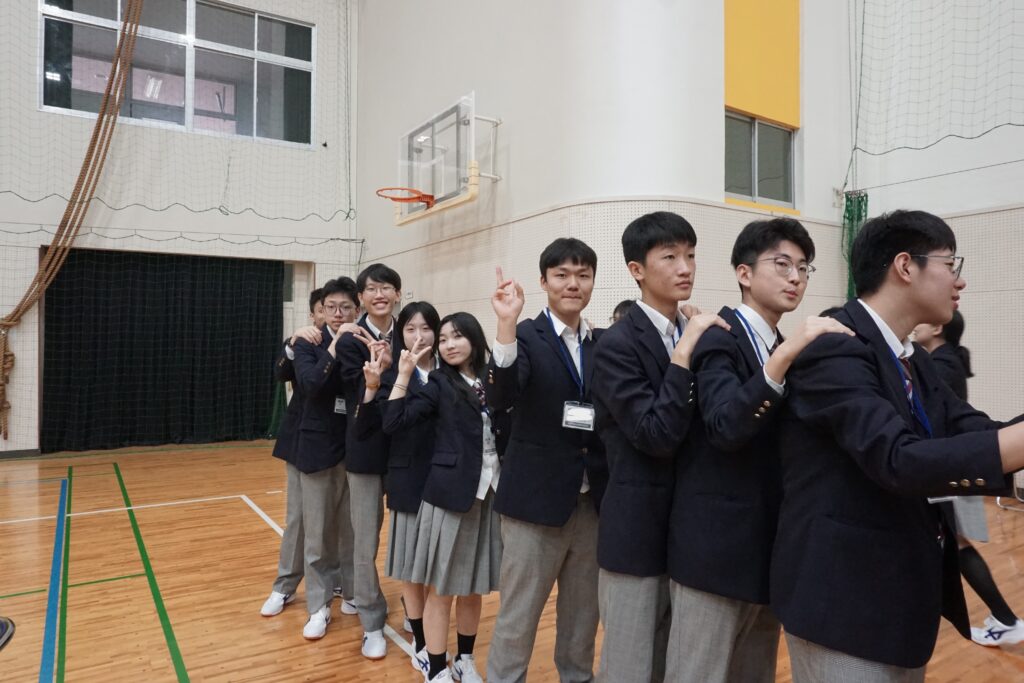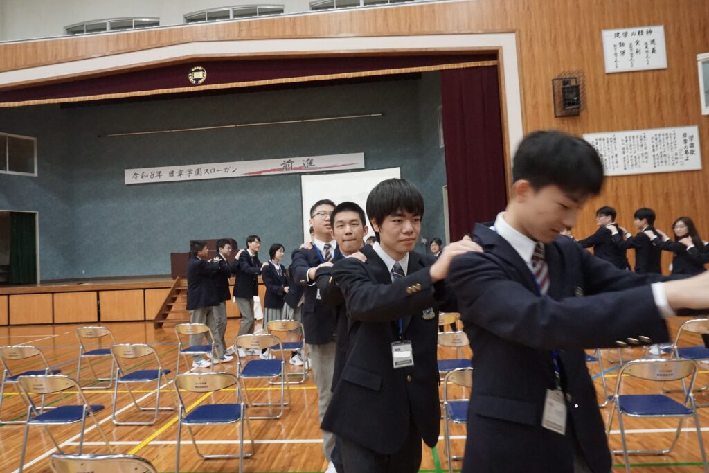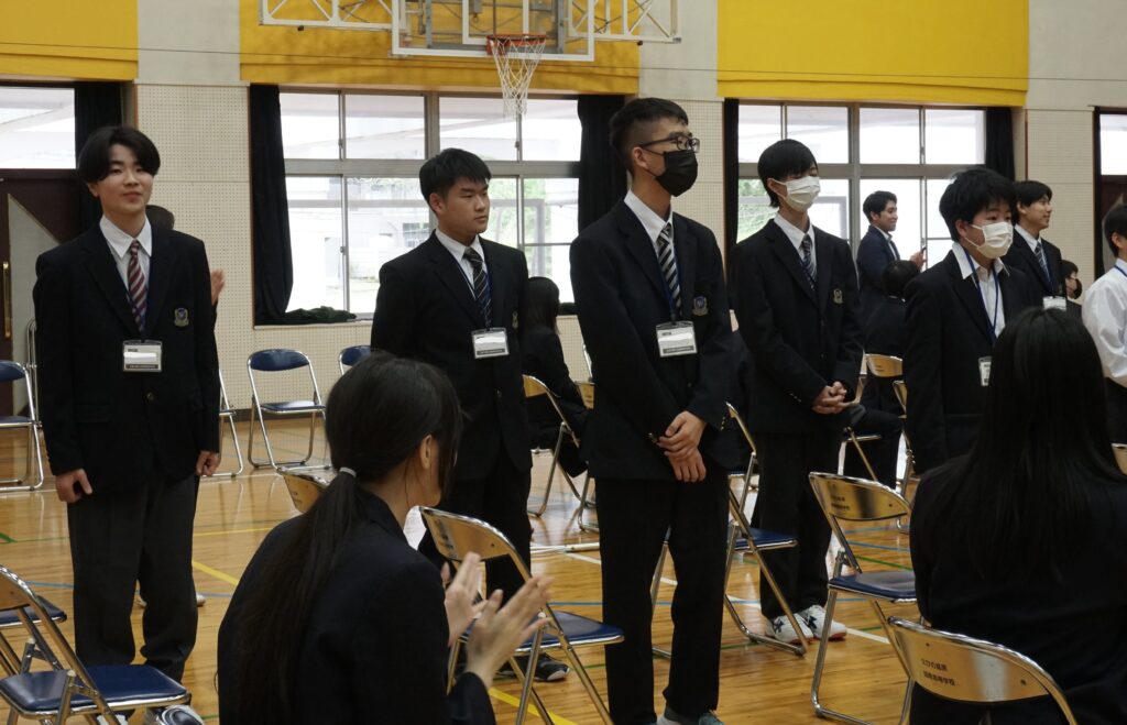 4月13日本校体育館で在校生と新入生の対面式がありました。対面式は新入生に早く学校に馴染んでもらおうと在校生が主体となって企画・運営しました。在校生の壇上での自己紹介やじゃんけん列車などのレクリエーションが行われ、会場は和やかな雰囲気に包まれました。ゲームが進むにつれて皆笑顔が見られ、新入生と在校生の距離が縮まったように感じました。