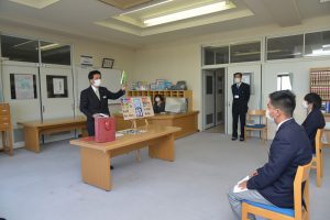 桜の花びらが舞う中、新学期がスタートし、本校図書室で始業式がありました。コロナウイルス感染拡大の影響で例年より縮小して行われました。