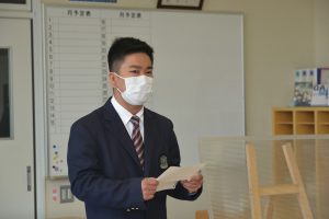 校長訓話では3密を避け、手洗いうがい、不要不急の外出を控えようなどの感染拡大防止法について説明があり、「体は離れても心は一つに」頑張っていこうと生徒たちを励ましました。