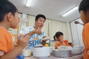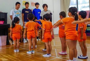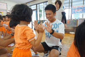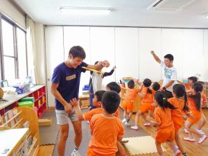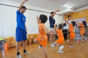 年中と年長クラスの園児たちと体育遊びを通して交流しました。生徒たちは最初緊張している様子でしたが、元気な園児たちのおかげですぐに仲良くなり、楽しそうに体を動かしていました。終わる頃には子供たちに囲まれ、押しつぶされている様子も見られました。すっかり人気者になった本校生徒たちは「子どもたちに癒された~」「人生最大のモテ期が来た~」と嬉しそうに話していました。