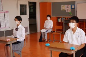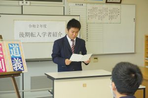 本校は半年毎に単位が認定される2学期制です。10月1日(木)から後期が始まりました。1時間目には新入者紹介と始業式がありました。新入生に対して在校生の松尾君は「2人の入学は心から嬉しく思うとともに、僕の勉強に対する気持ちを更に掻き立ててくれた。これからは切磋琢磨してたのしい学校生活を送りましょう」と歓迎の言葉を述べました。