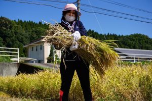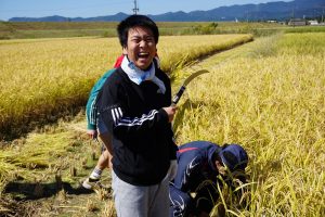 10月20日(火)にえびの市の柳田公幸さん(川原農産株式会社)の田んぼにお邪魔して稲刈り体験しました。初めて体験する生徒が多かったのですが、稲の刈り方を丁寧に教わった後は、鎌を使って楽しそうにどんどん稲を刈っていました。