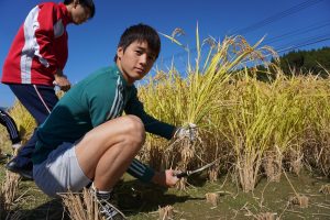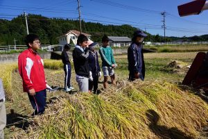 最後に生徒代表の松尾君が「普段何気なく食べているお米ですが、今回お米を作ってくださった方と一緒に稲刈りをしたことで、お米の大切がよくわかりました。一粒一粒大切に噛みしめて食べたいと思います」と感謝の言葉を述べました。