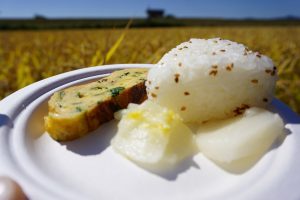 稲刈り体験の後は柳田さん特製の新米おにぎりと卵焼きをみんなでいただきました。とてもおいしくておにぎり6個食べた生徒もいました。