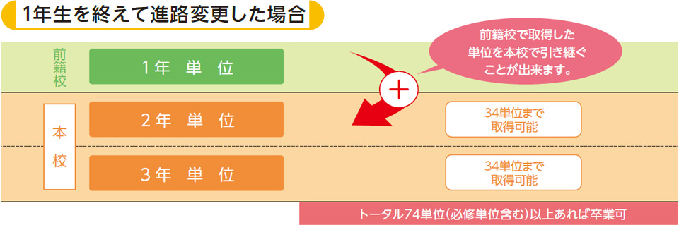 ※単位制とは、学年ごと、クラスごとに時間割が決まっているわけではなく、個人の進路に合わせて時間割を組めるということです。3年間で必修科目を含めて74単位取得すれば卒業できます。本校では前籍校で修得した単位も活かすことができますから、より短い期間で卒業可能です。